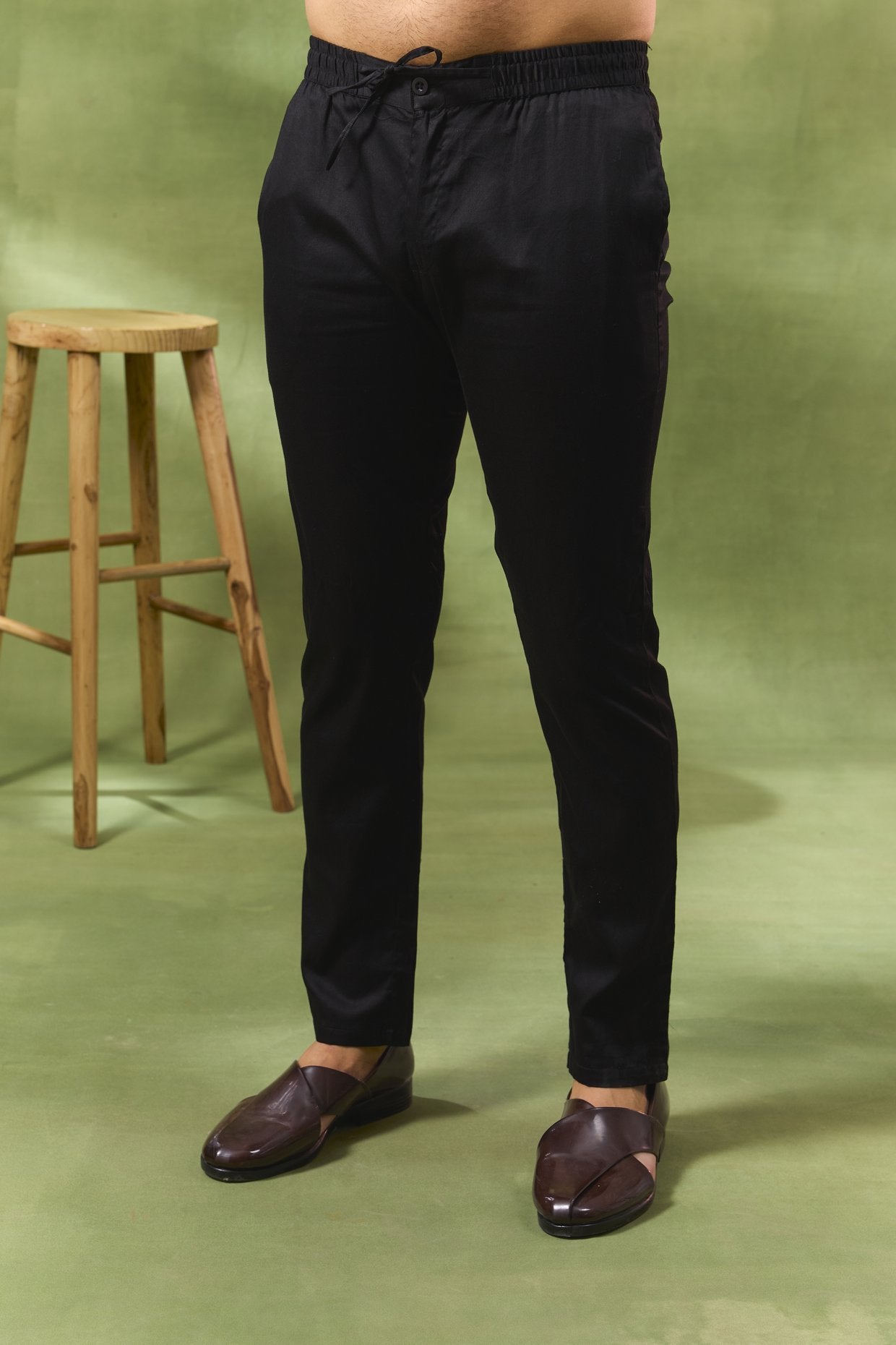 Black large geometric design embroidered Sherwani in a blended silk base fabric. This Sherwani is paired with black cotton satin pants.
