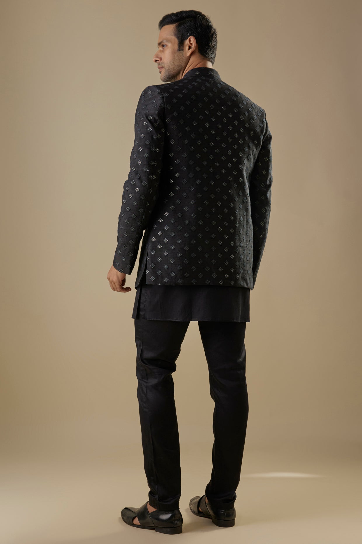Black embroidered open jacket in a dupion silk base fabric. This jacket is paired with a black cotton satin kurta and pants.