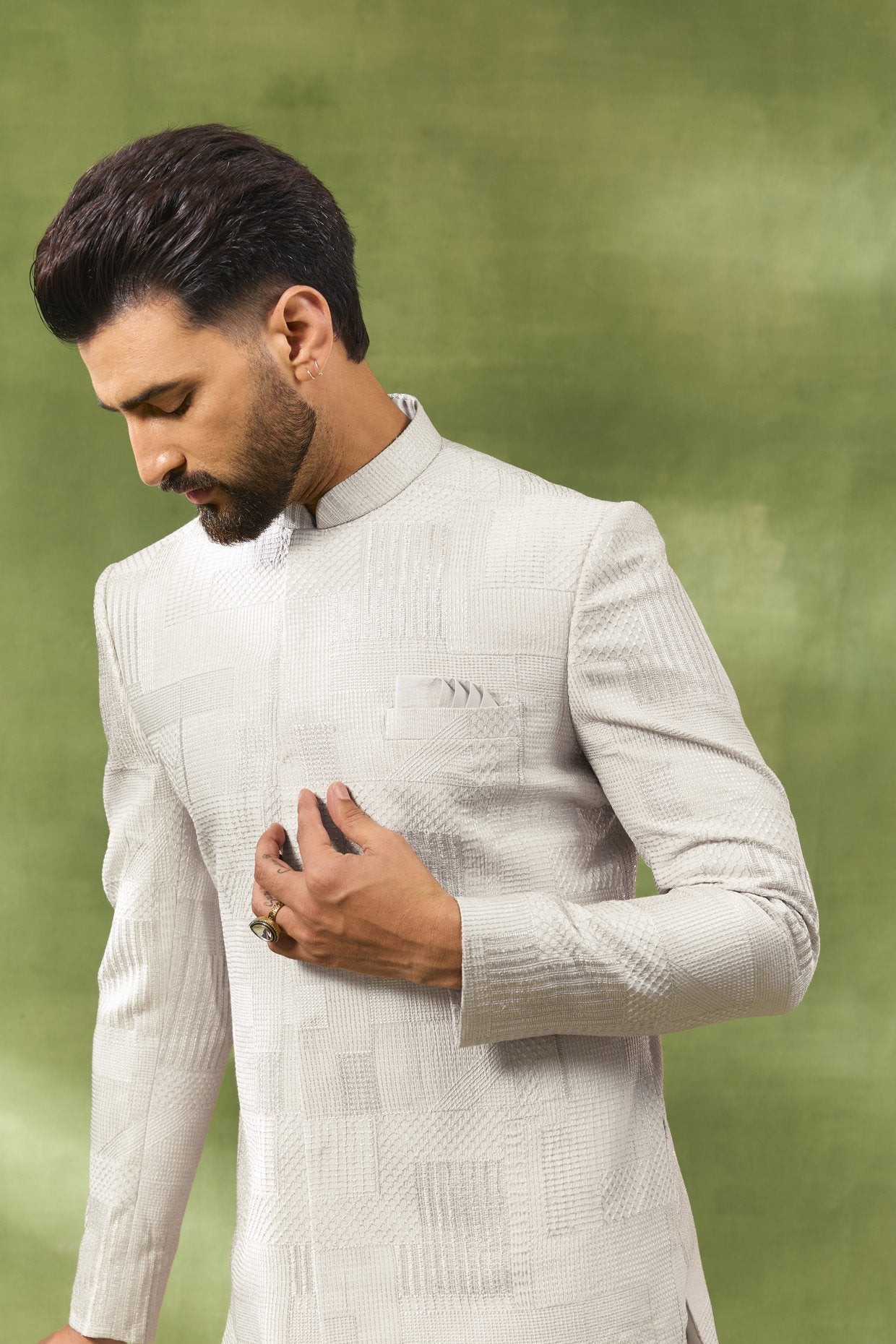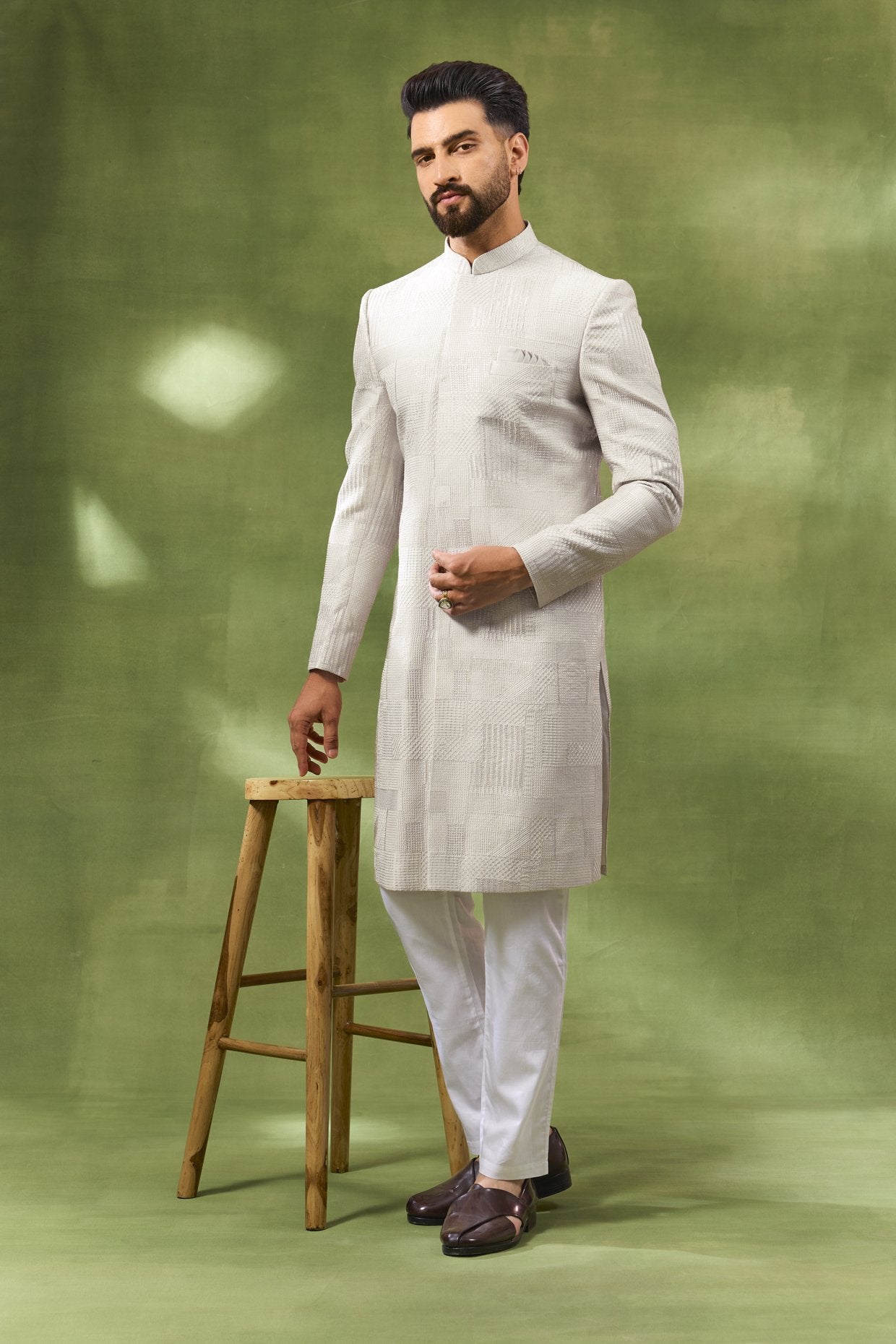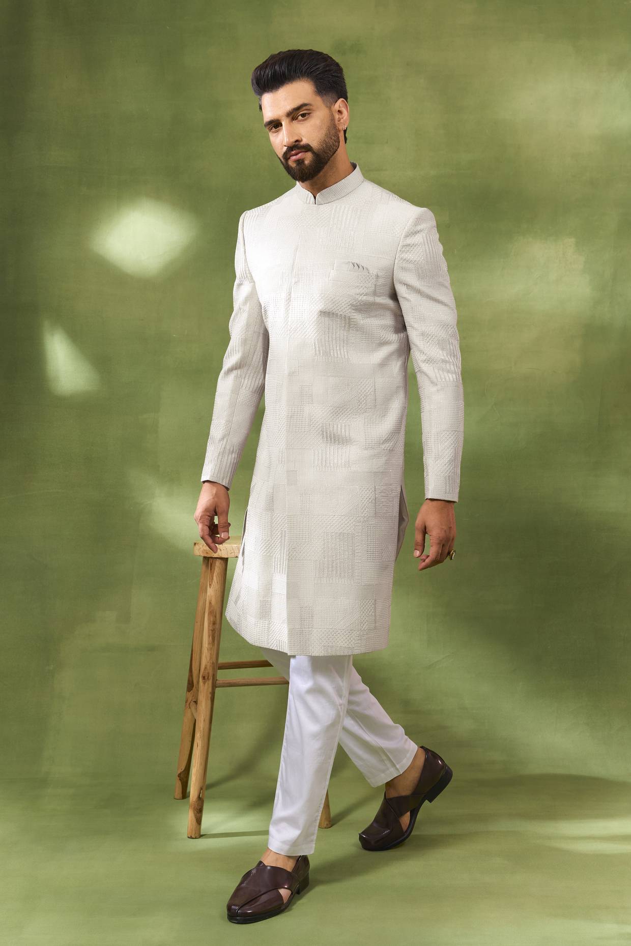 Cream Sherwani in a heavy pattern embroidered blended silk base fabric. This Sherwani is paired with white cotton satin pants.