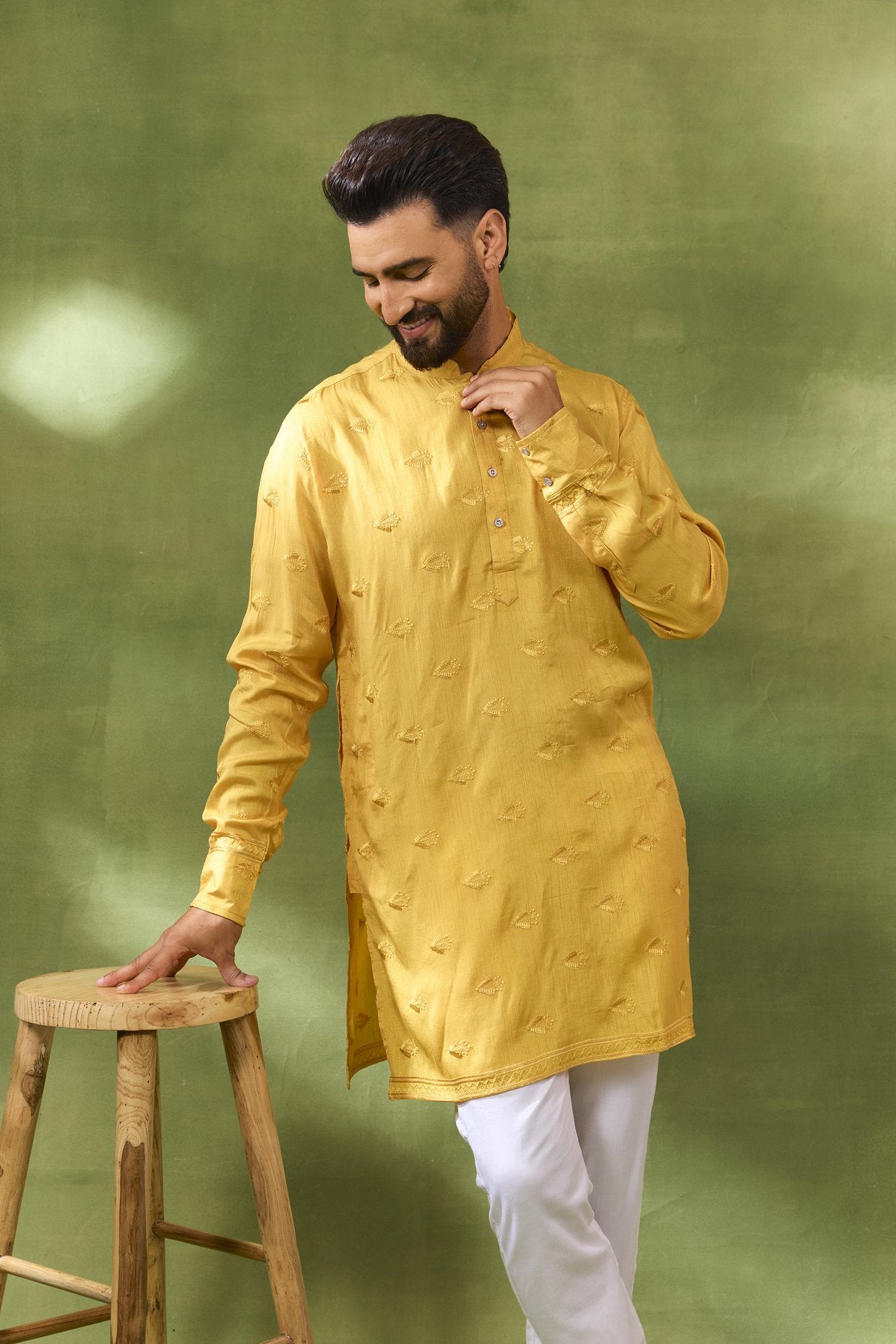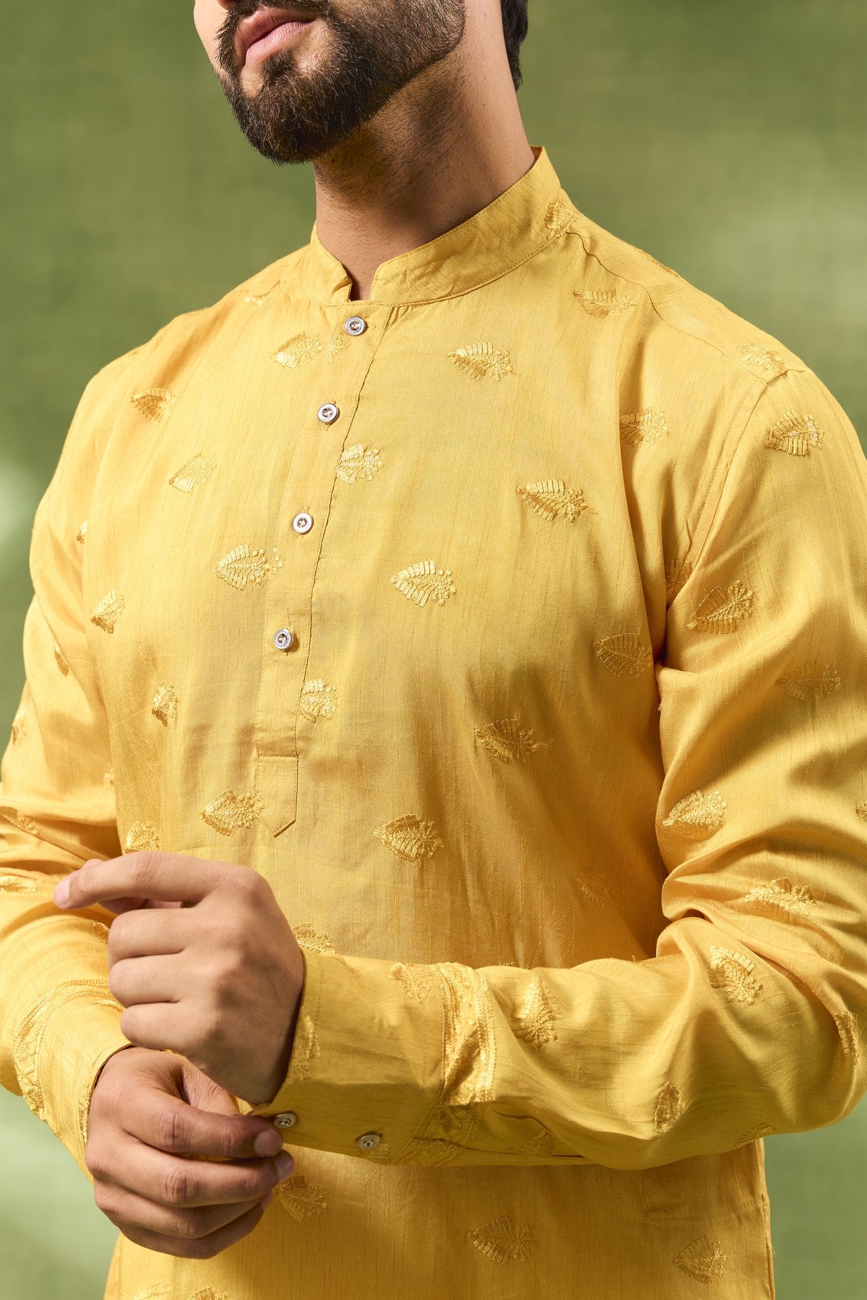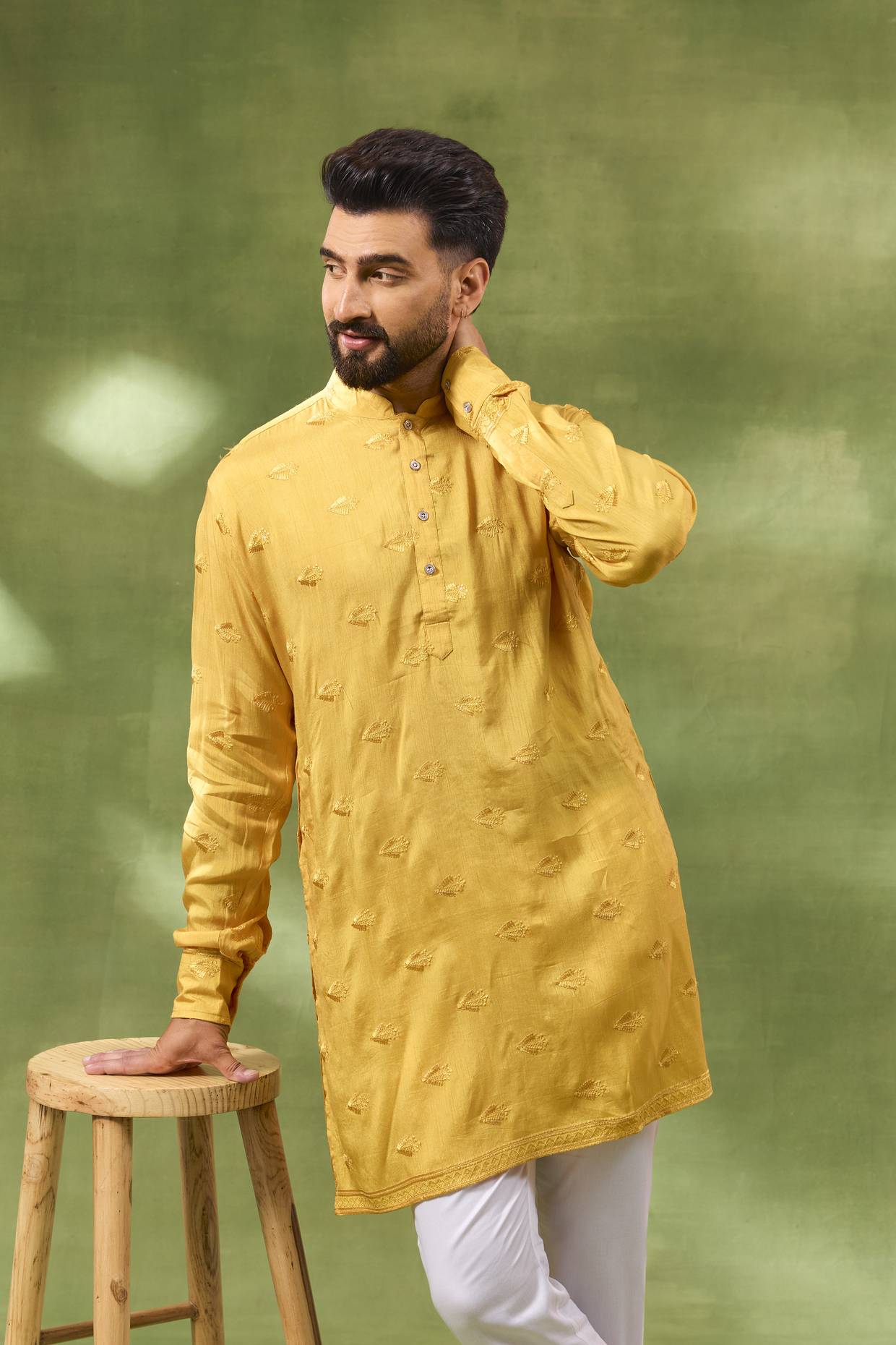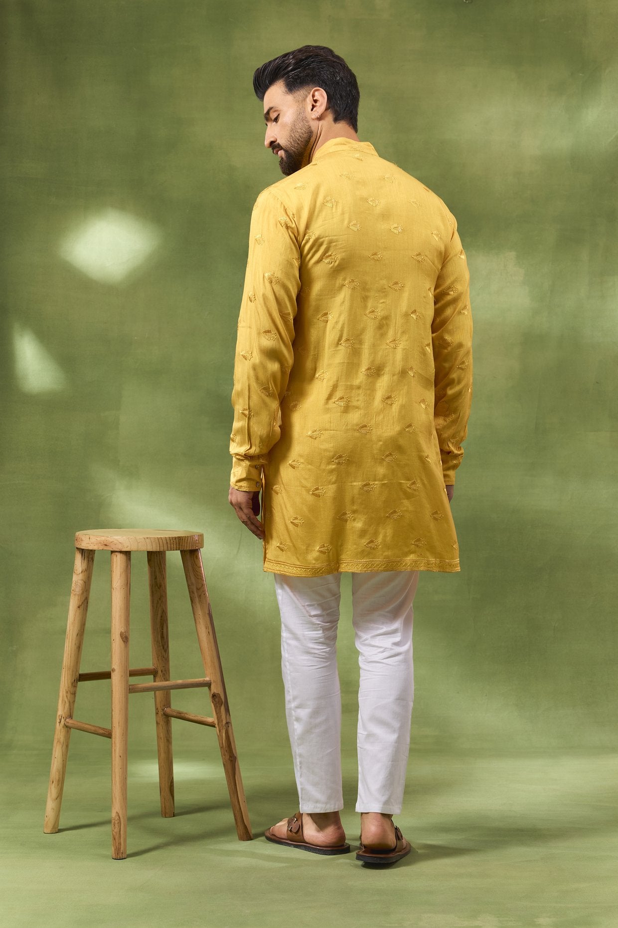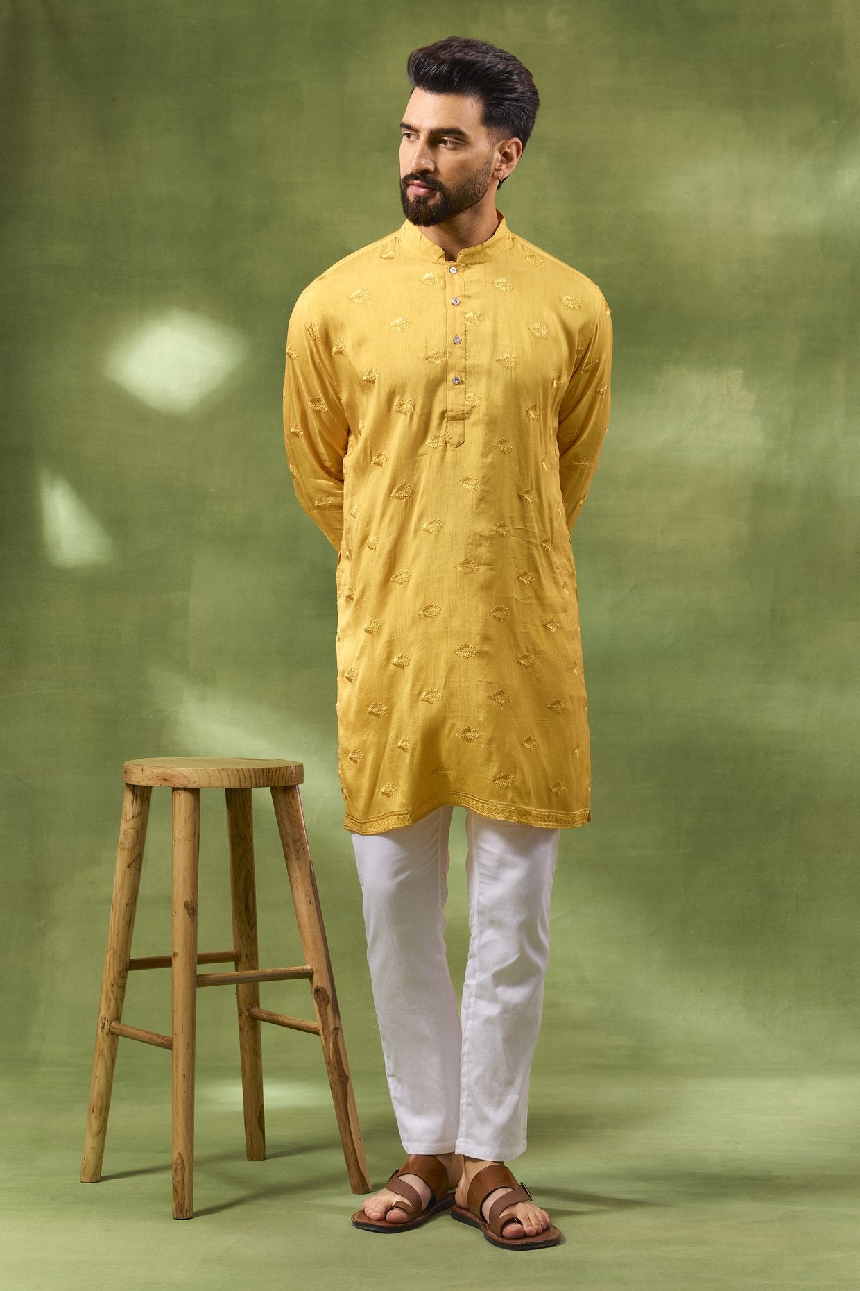 Mustard yellow kurta in a border embroidered blended silk base fabric. This kurta is paired with white cotton pants.
