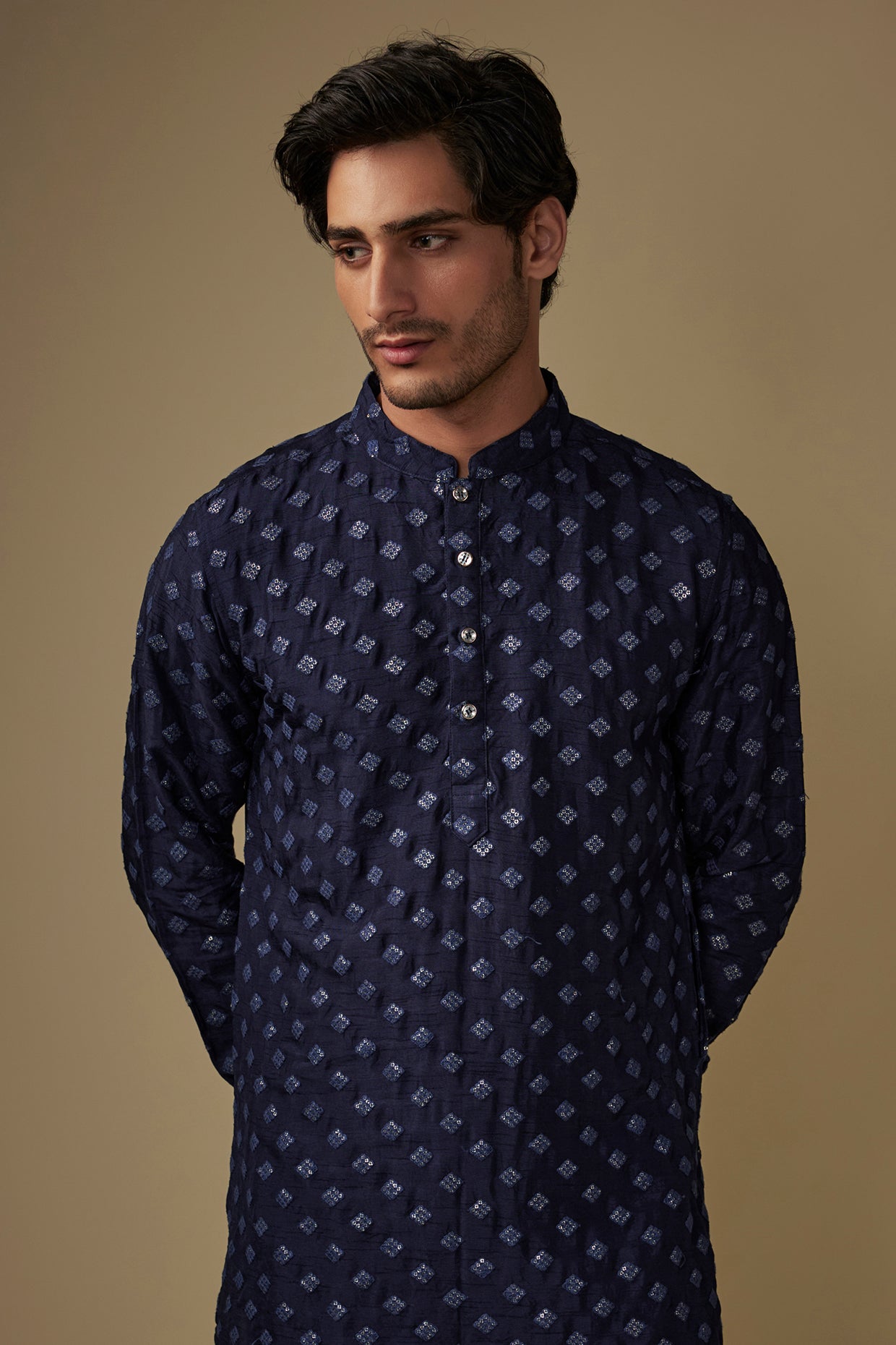 Navy blue embroidered kurta in a blended silk base fabric. This kurta is paired with navy cotton satin pants.