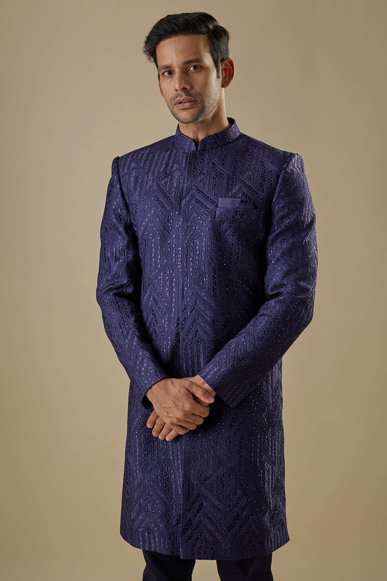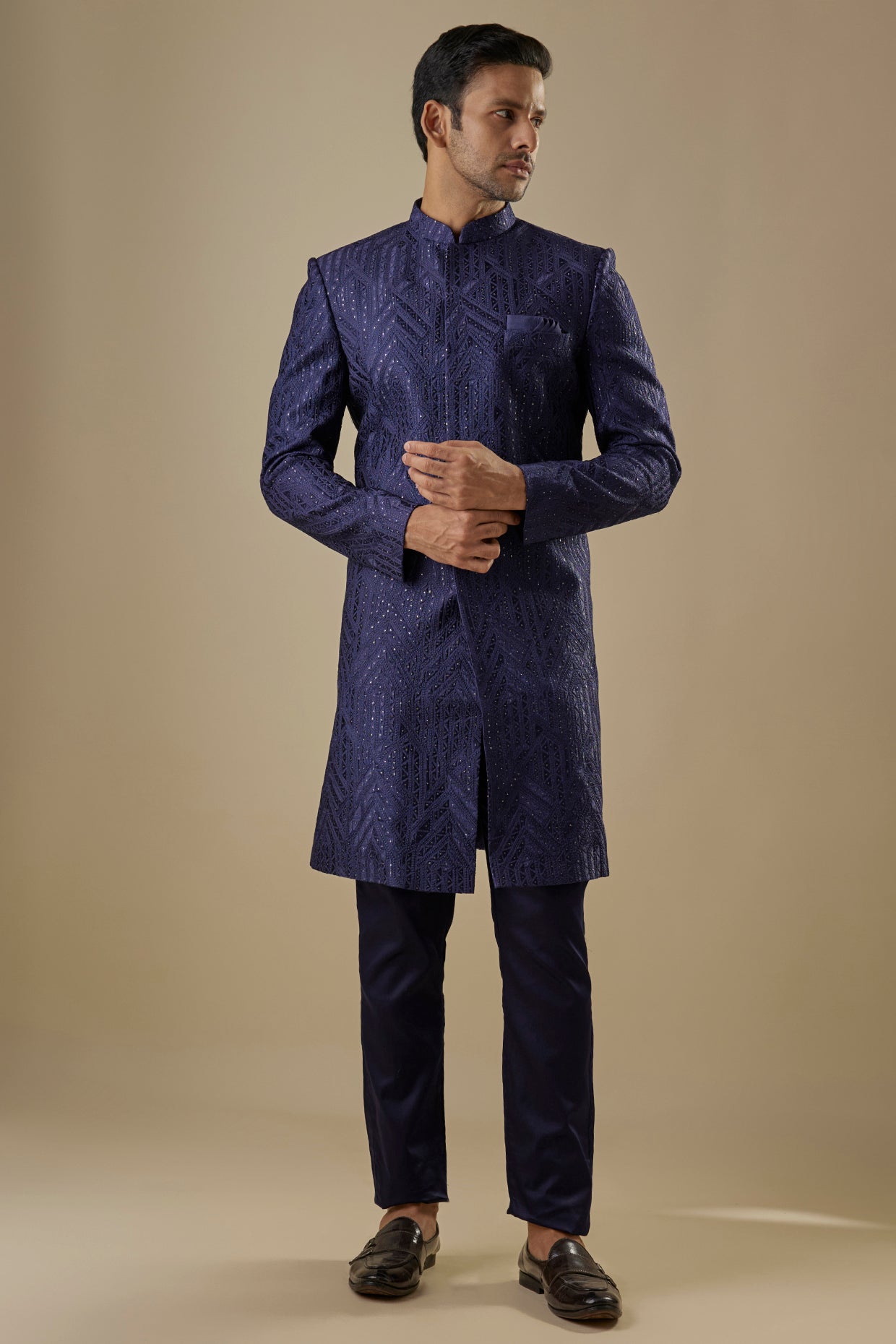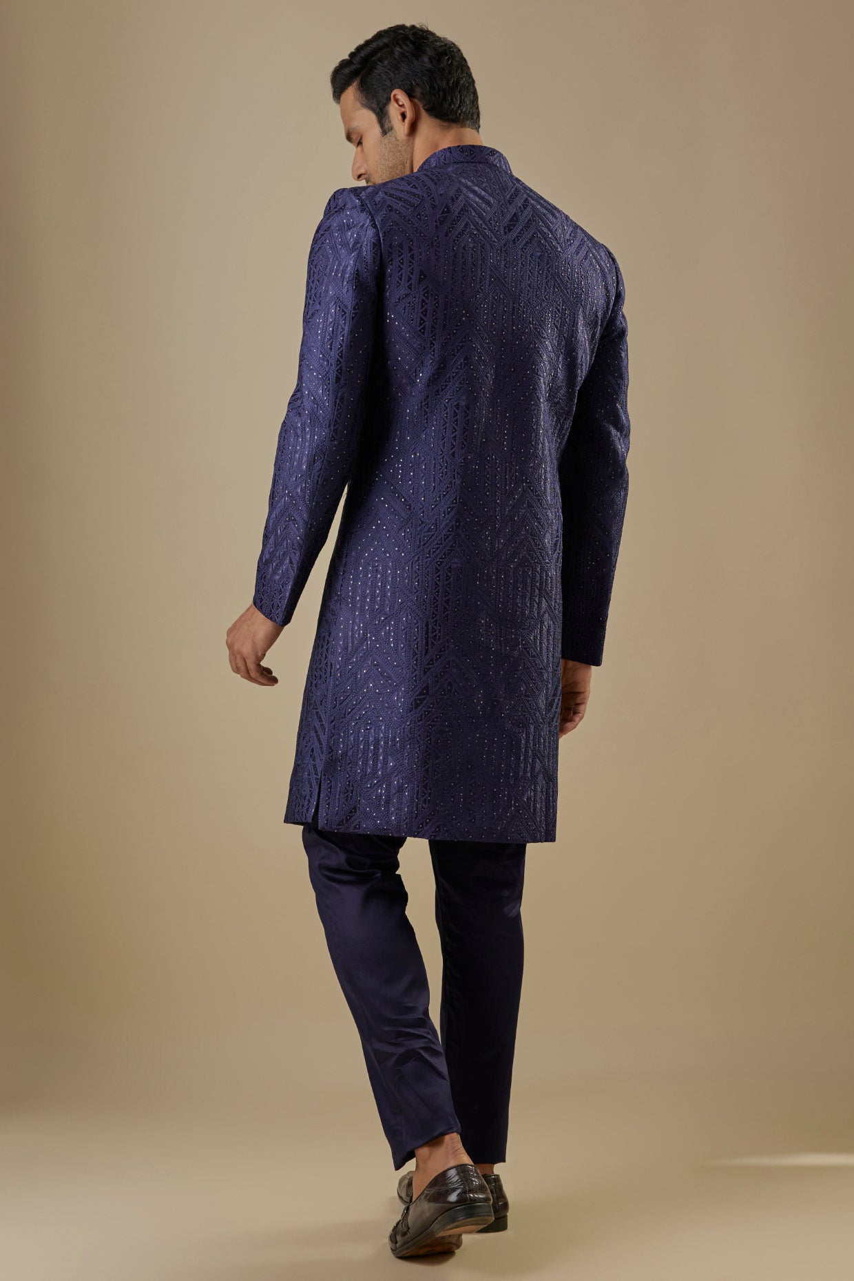 Navy blue geometric embroidered Sherwani in a dupion silk base fabric. This Sherwani is paired with navy blue cotton silk pants.