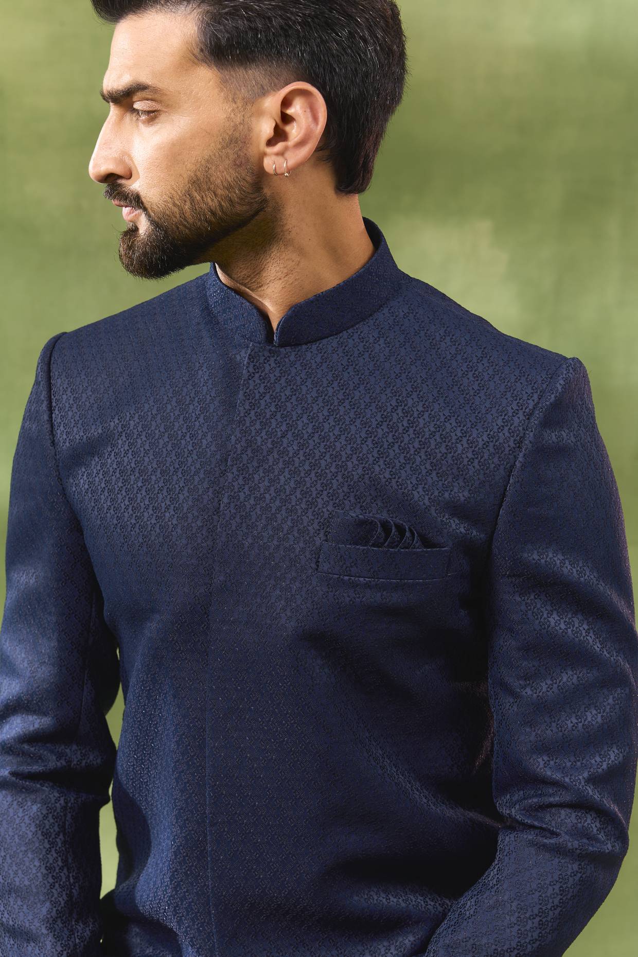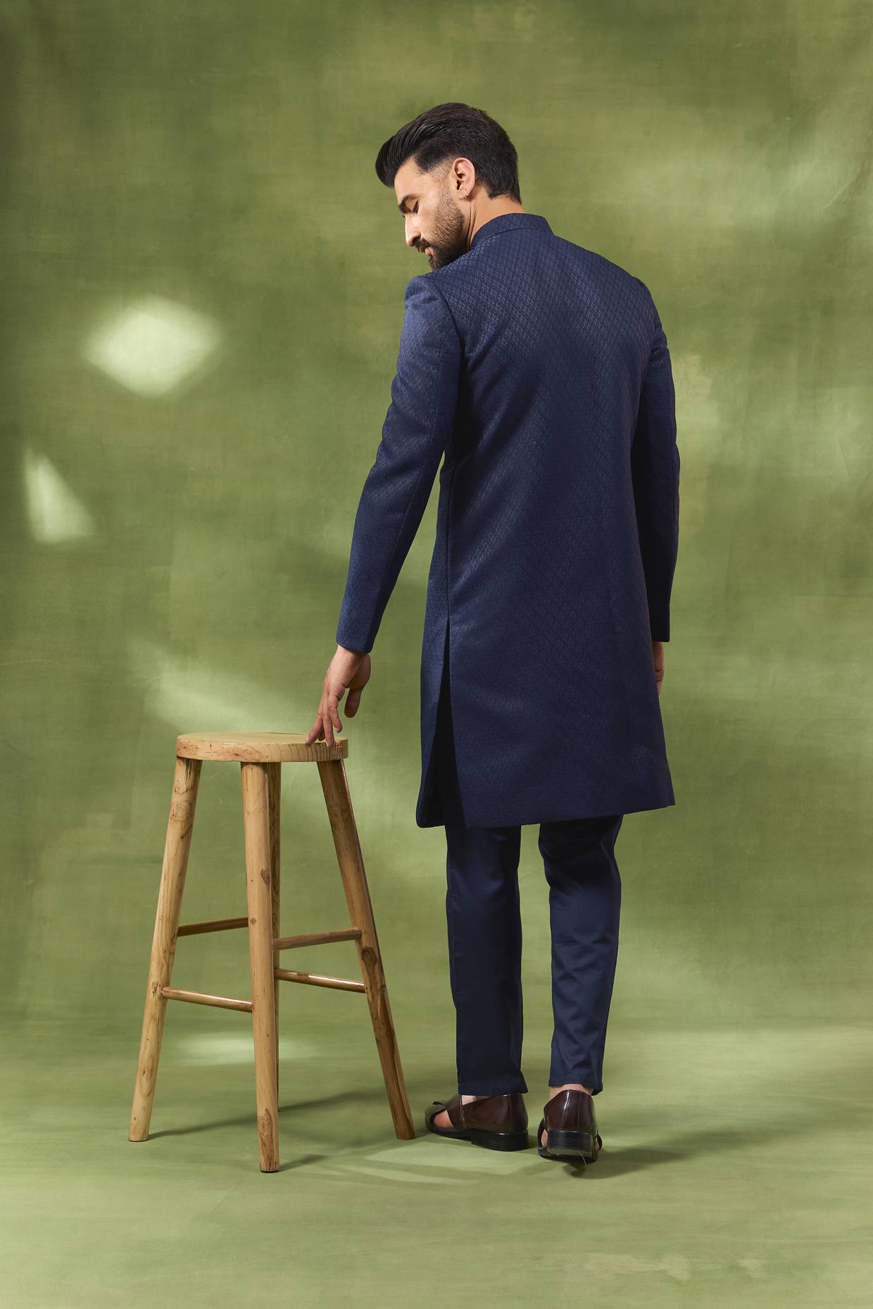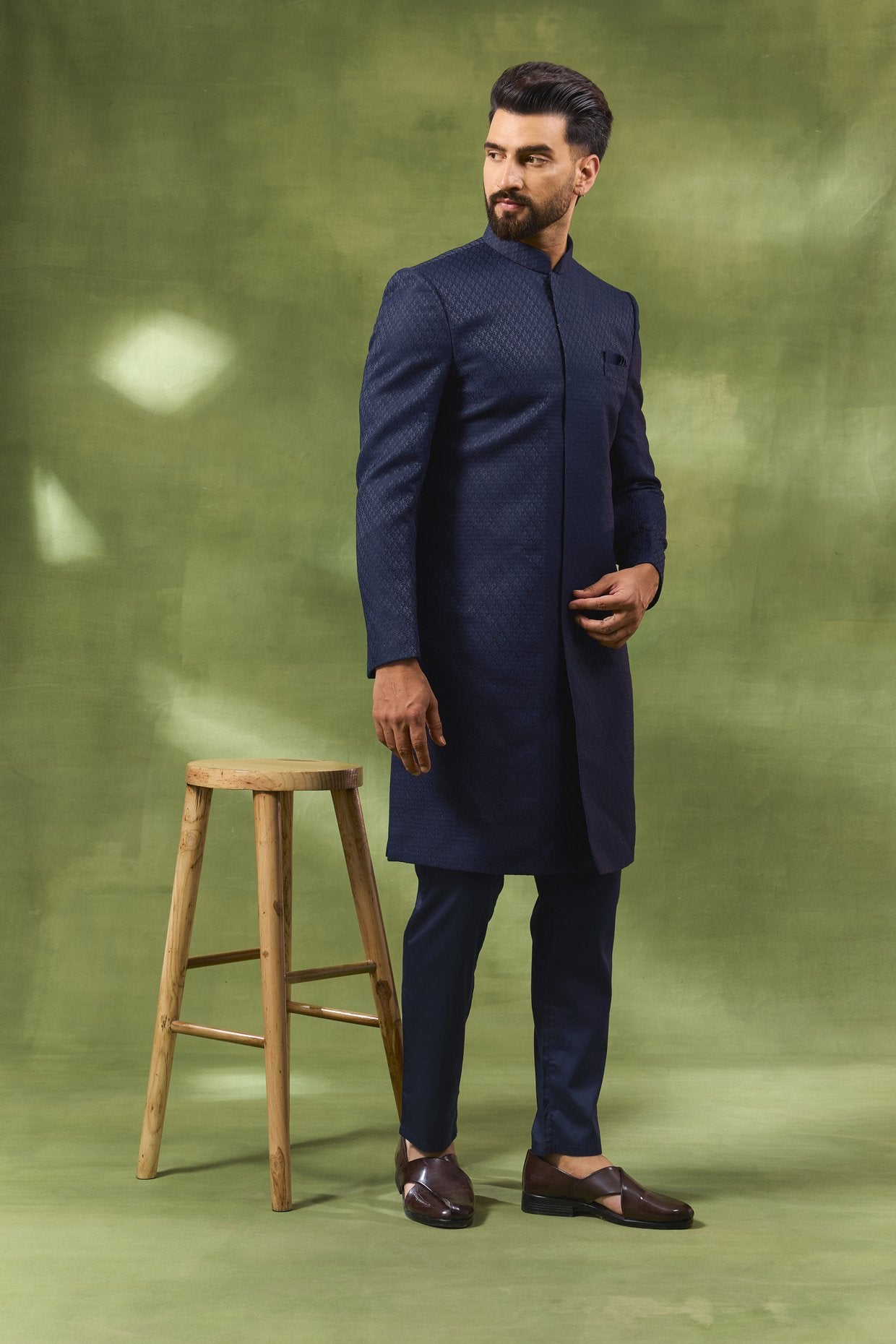 Navy blue jacquard embroidered Sherwani in a cotton silk base fabric. This Sherwani is paired with navy cotton satin pants.