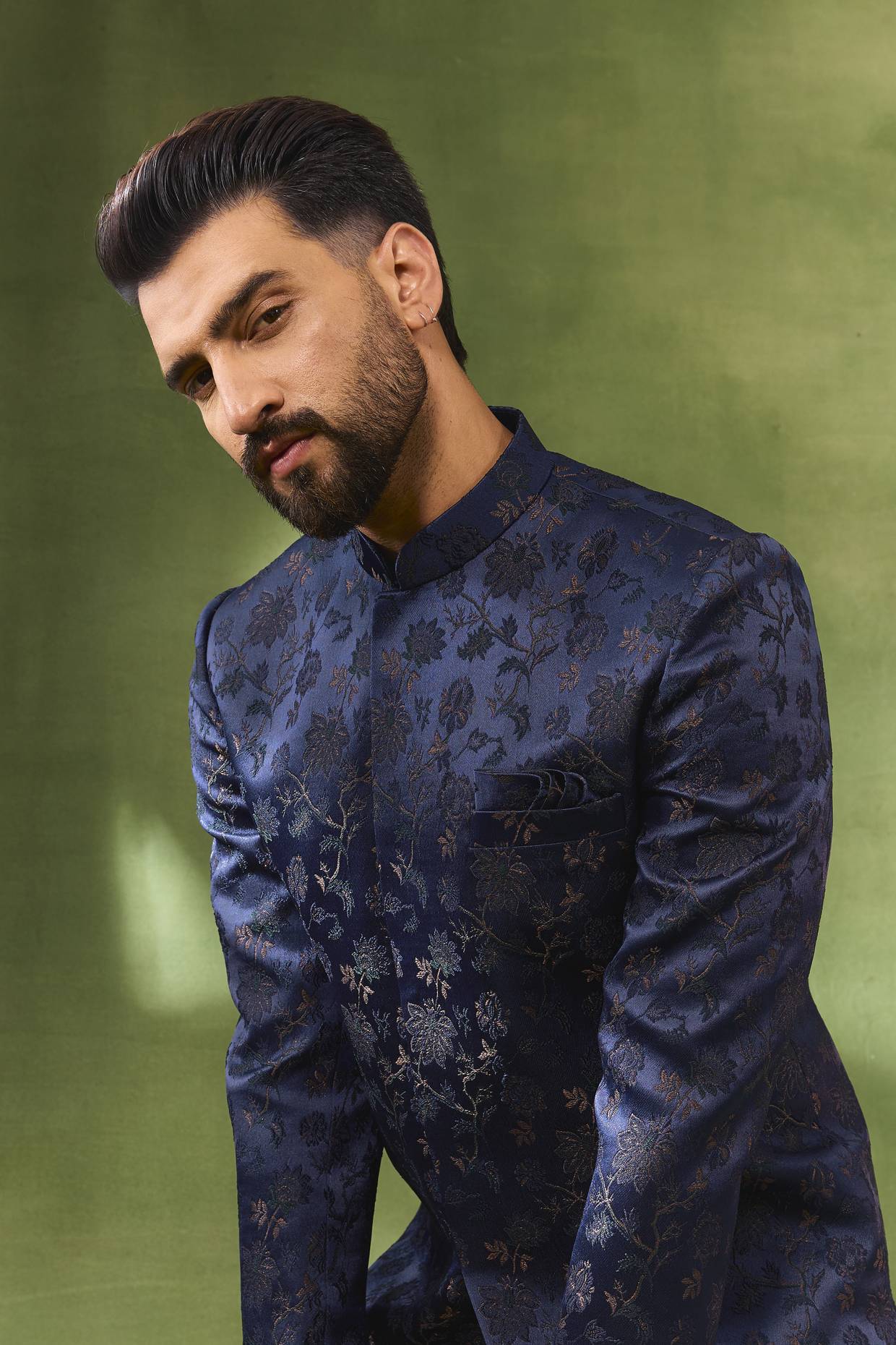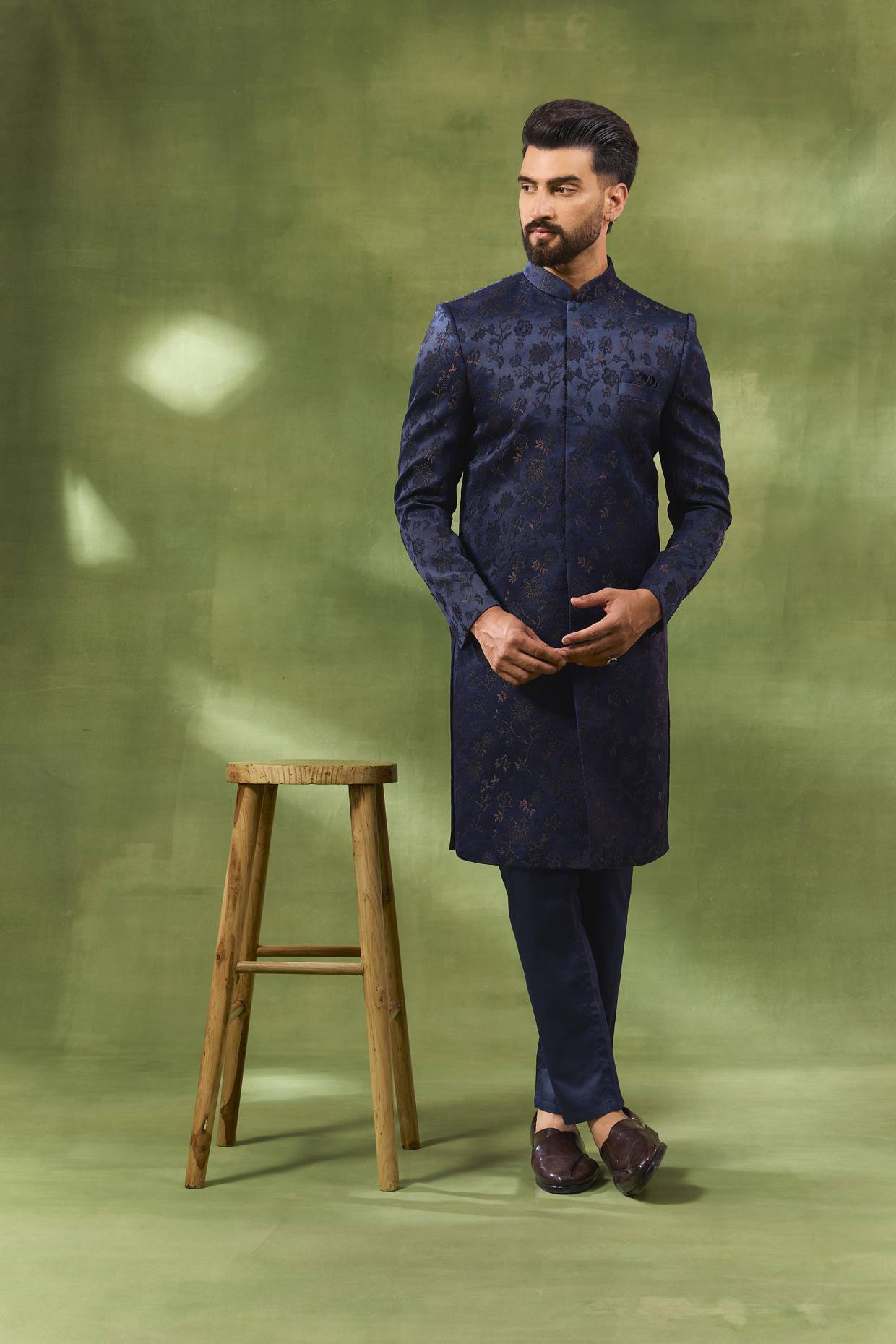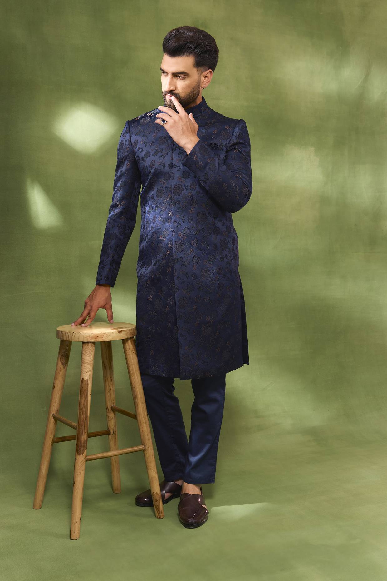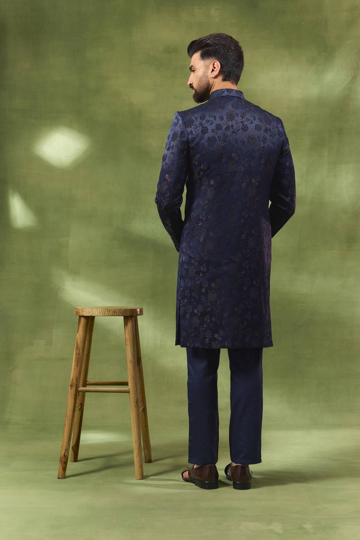 Navy blue & gold floral jacquard Sherwani in a cotton silk base fabric. This Sherwani is paired with navy cotton satin pants.