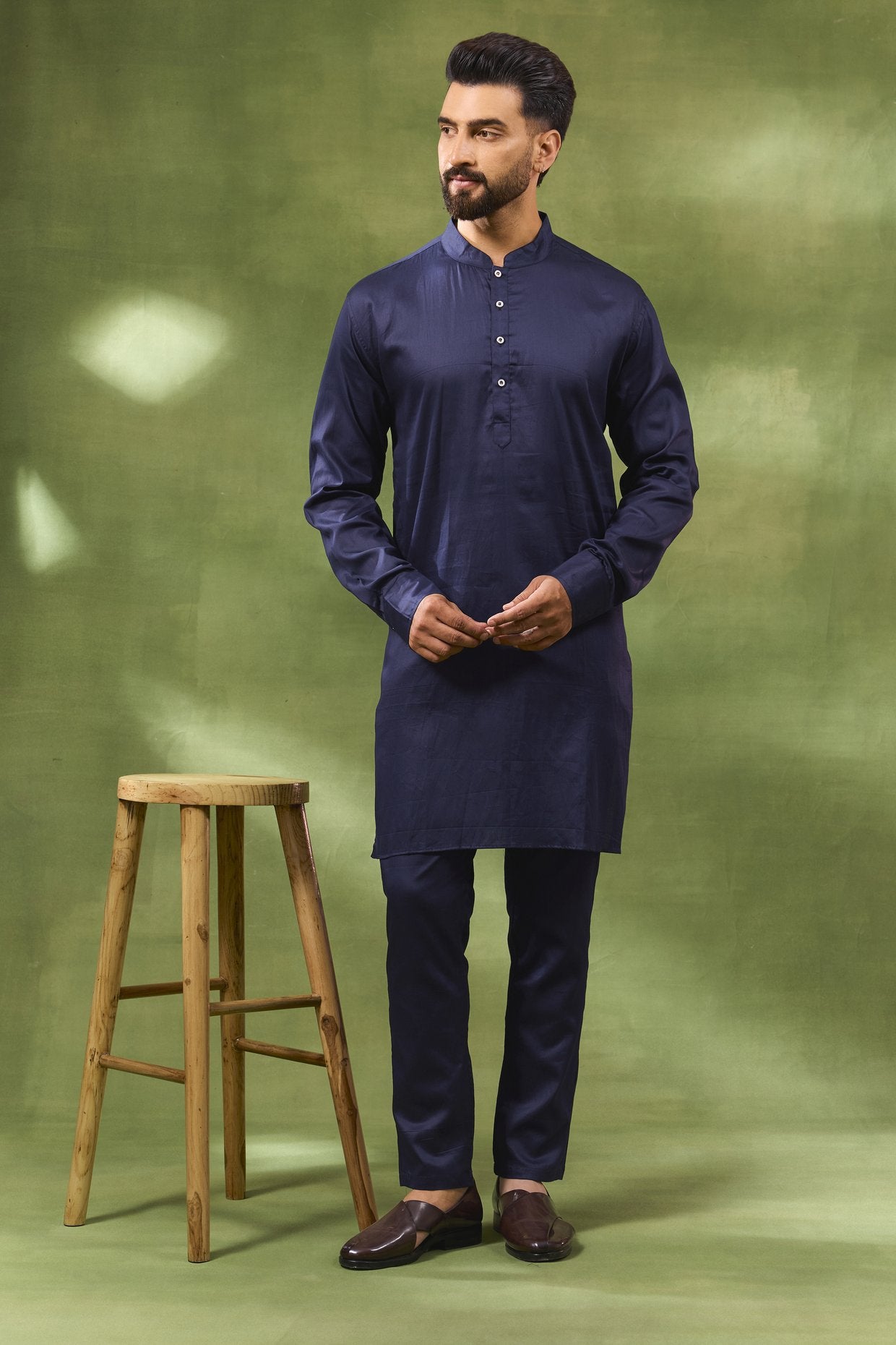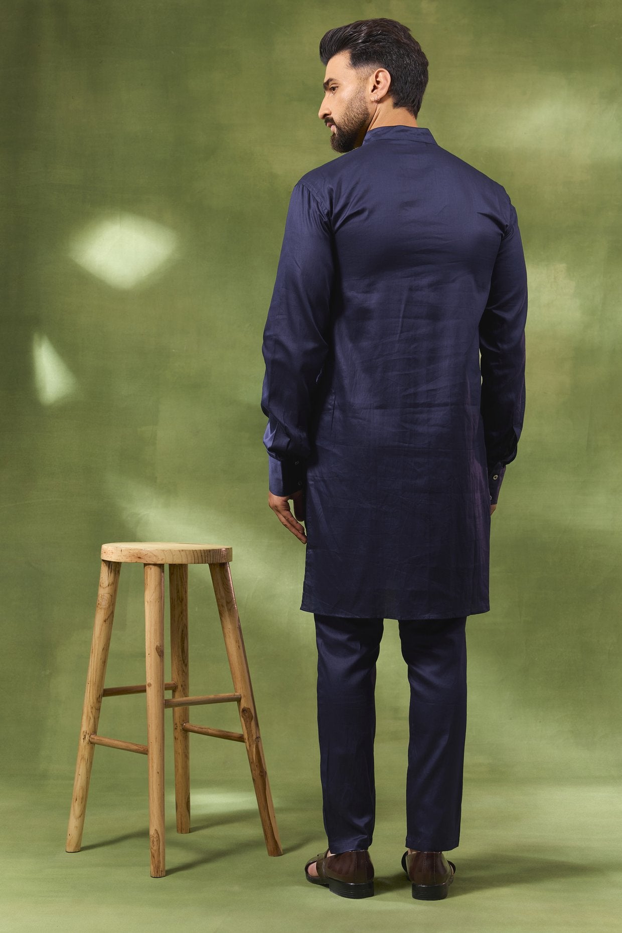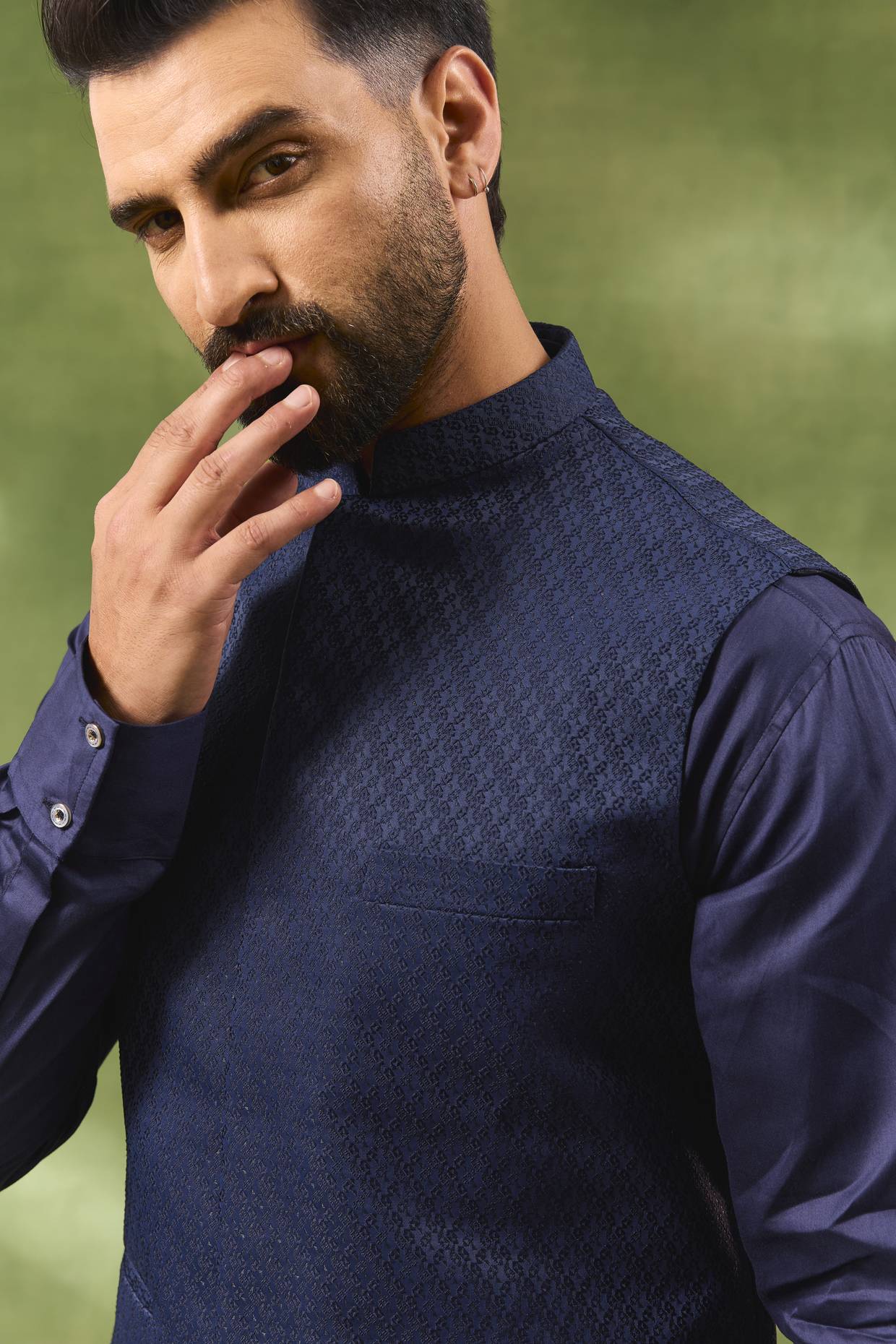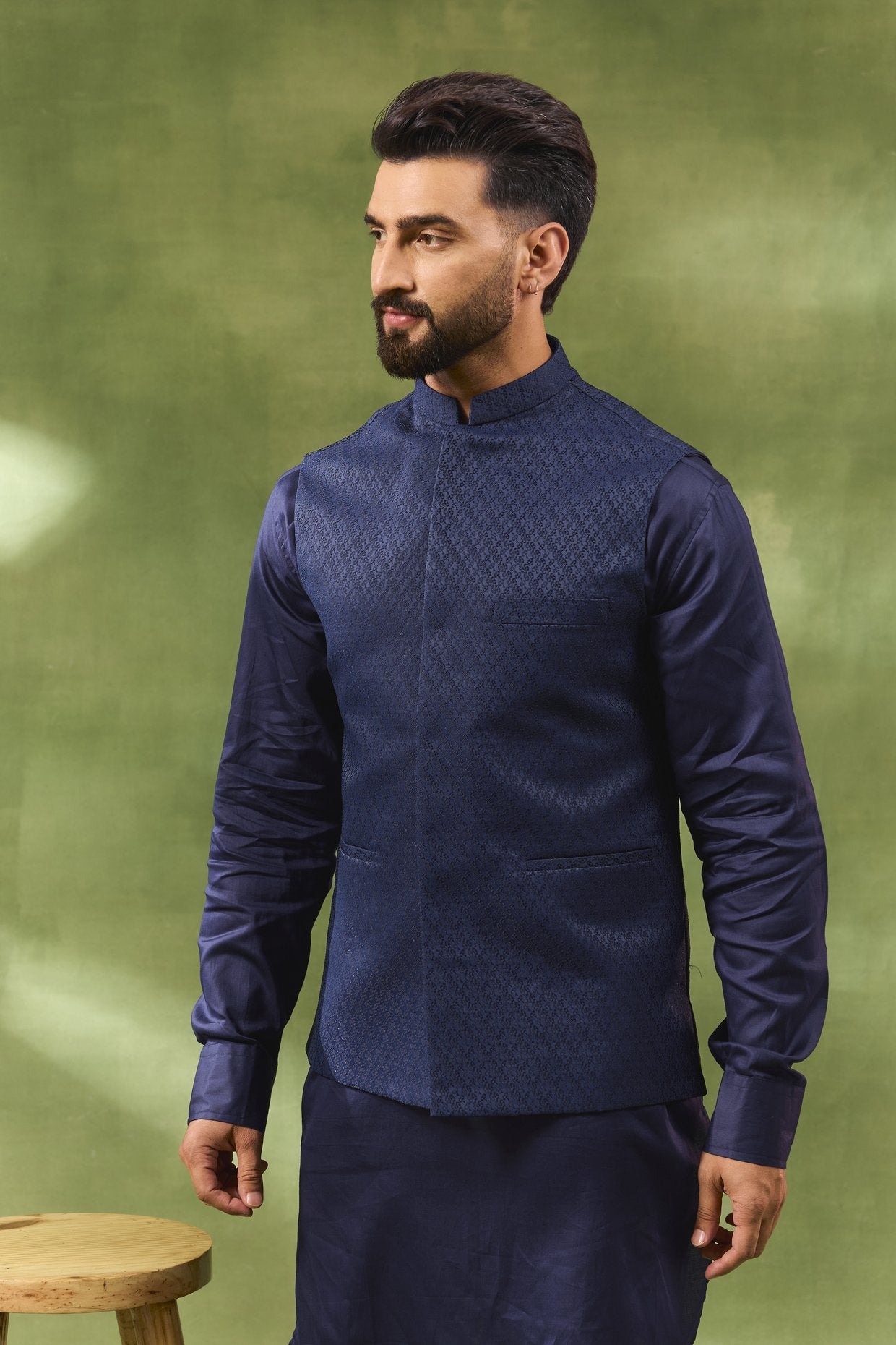 Navy blue geometric jacquard bundi jacket in a cotton silk base fabric. This jacket is paired with a navy cotton satin kurta and matching pants.