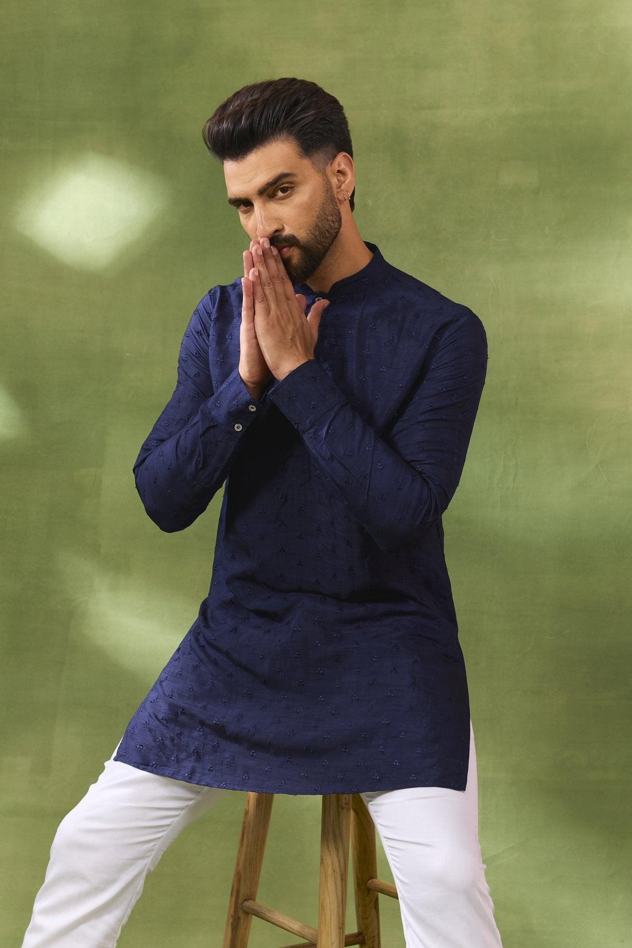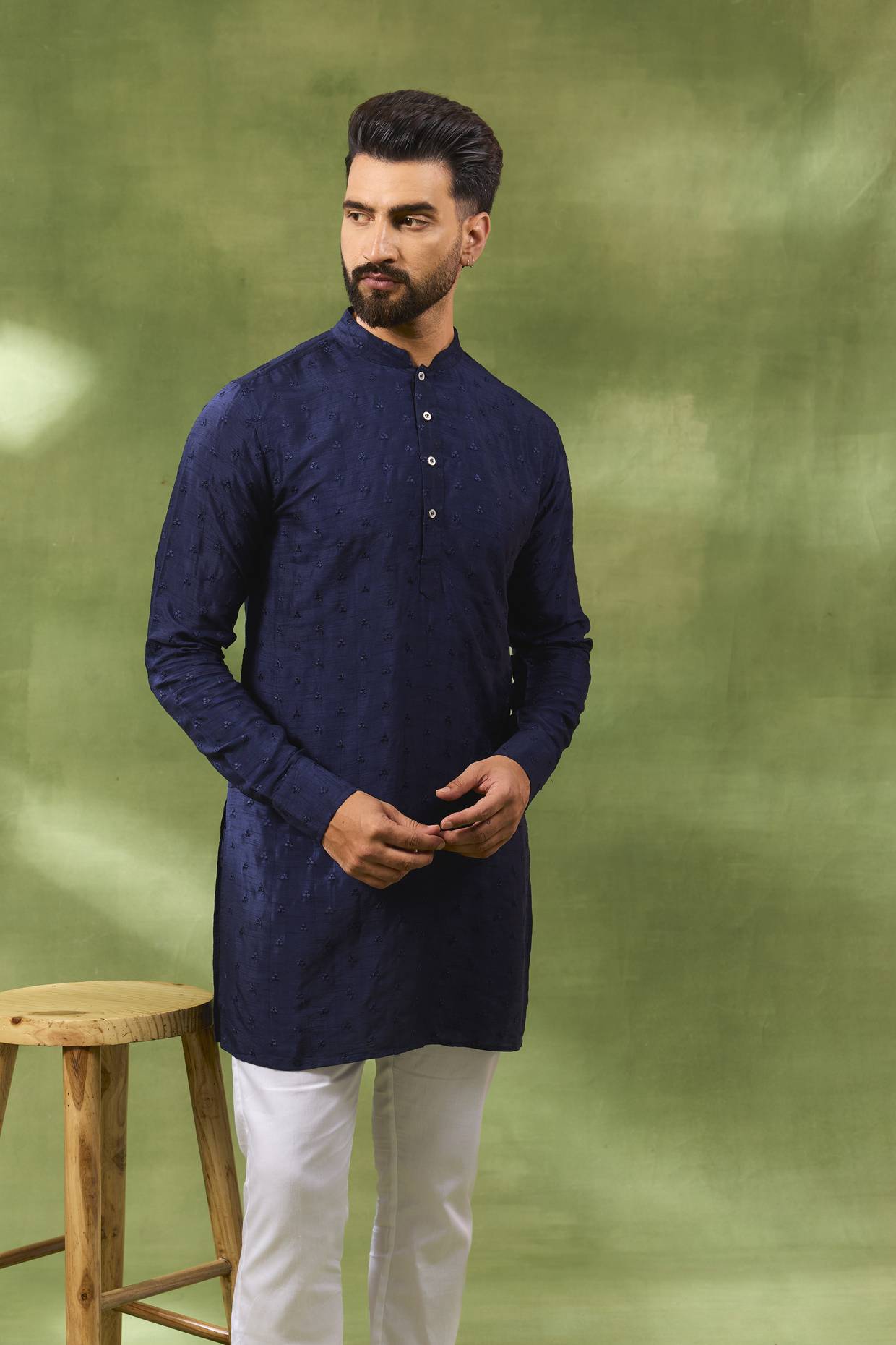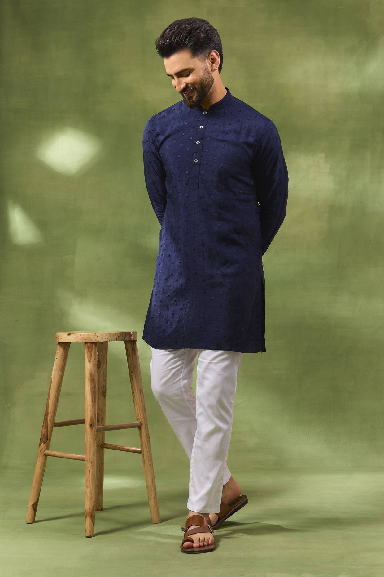 Navy blue kurta with thread work embroidery in a blended silk base fabric. This kurta is paired with white cotton pants.