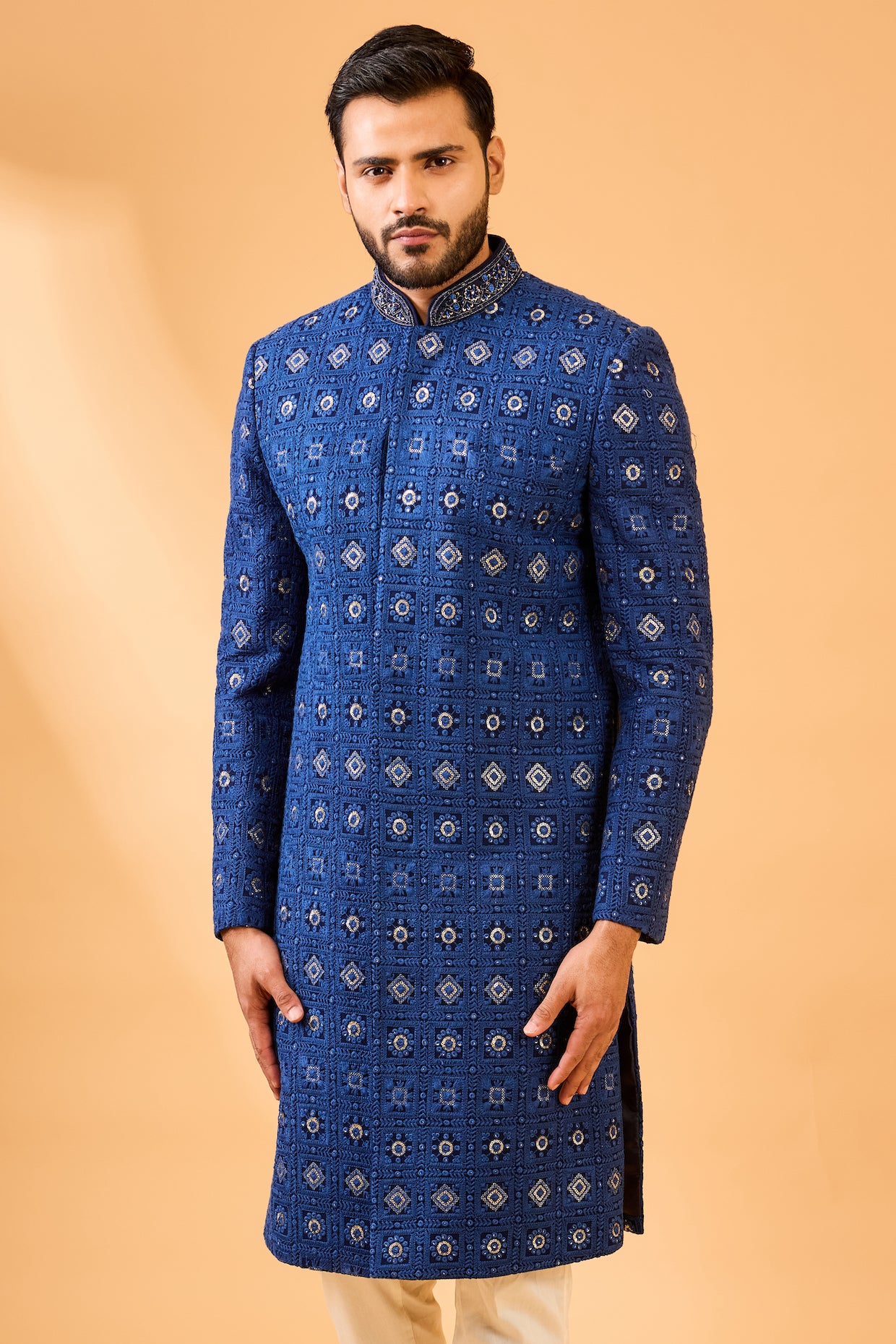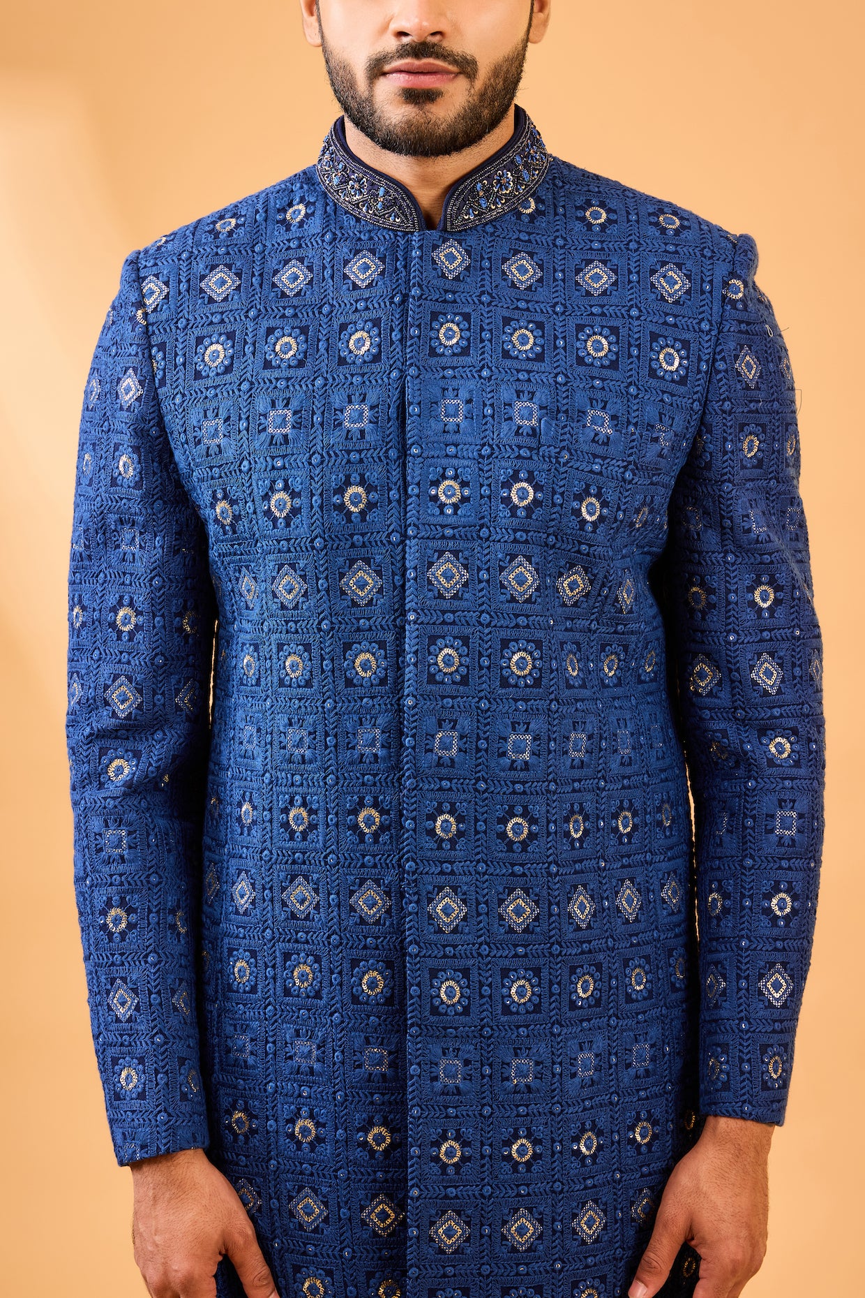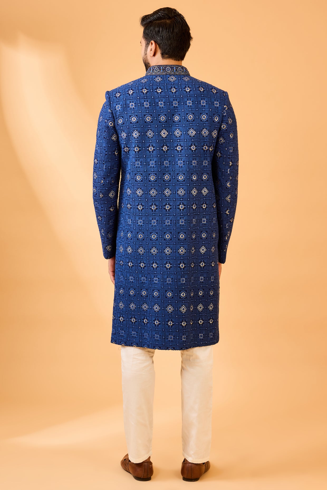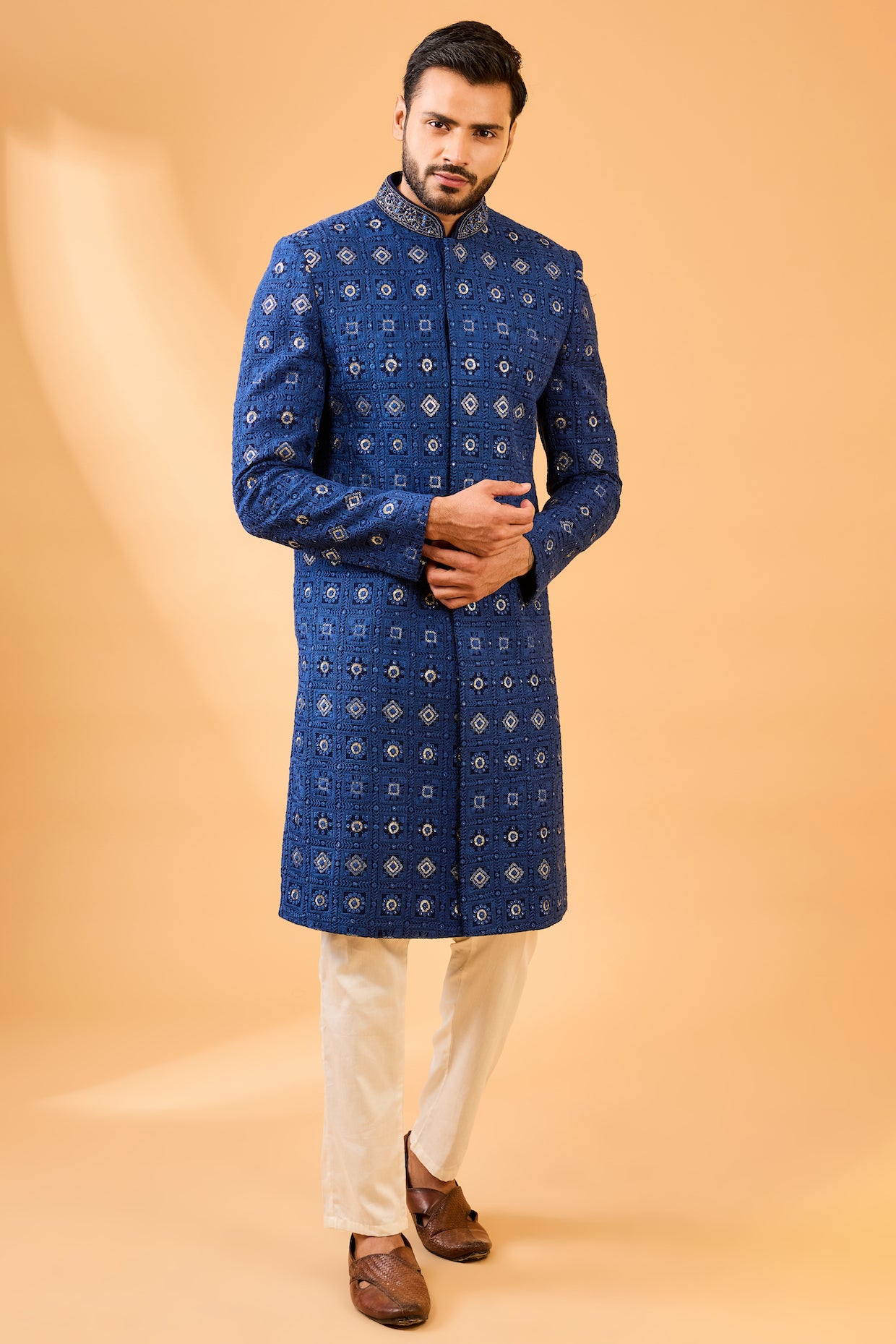 Navy Blue & Gold Embroidered Sherwani with collar work in a viscose base fabric. This Sherwani is paired with white cotton satin pants.