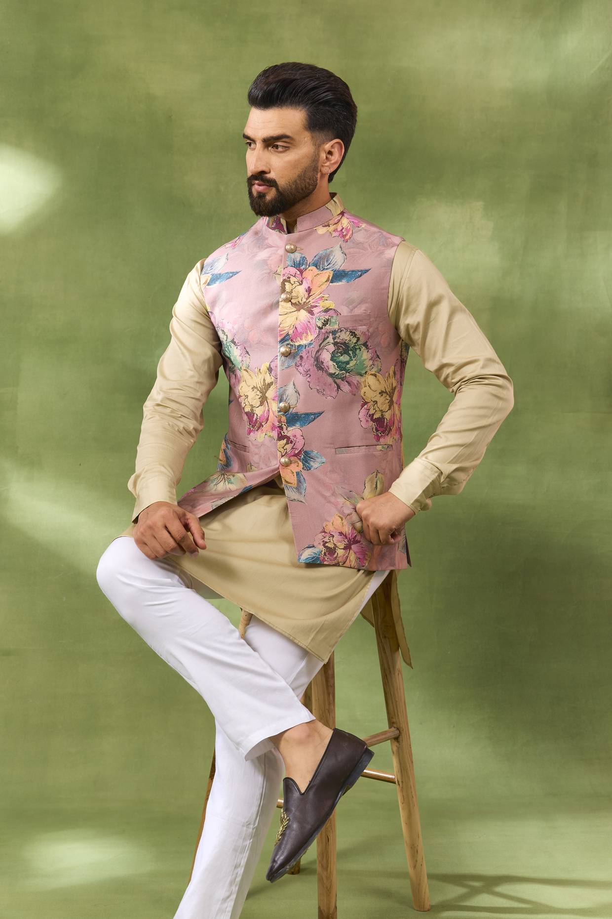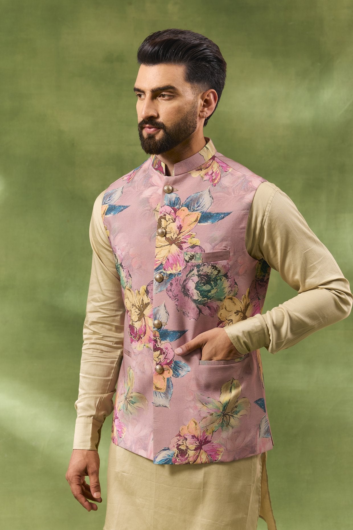 Pink botanical print bundi jacket in a blended silk base fabric. This jacket is paired with a beige kurta and white pants.