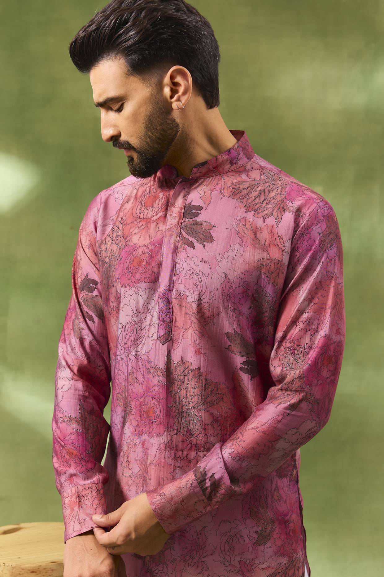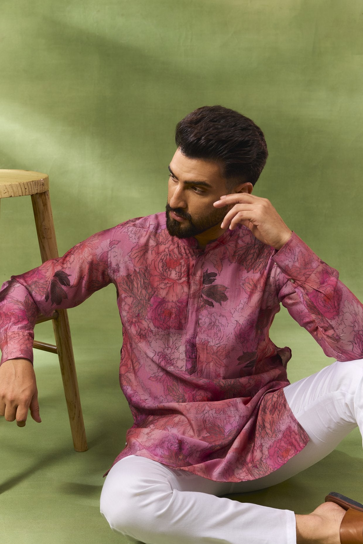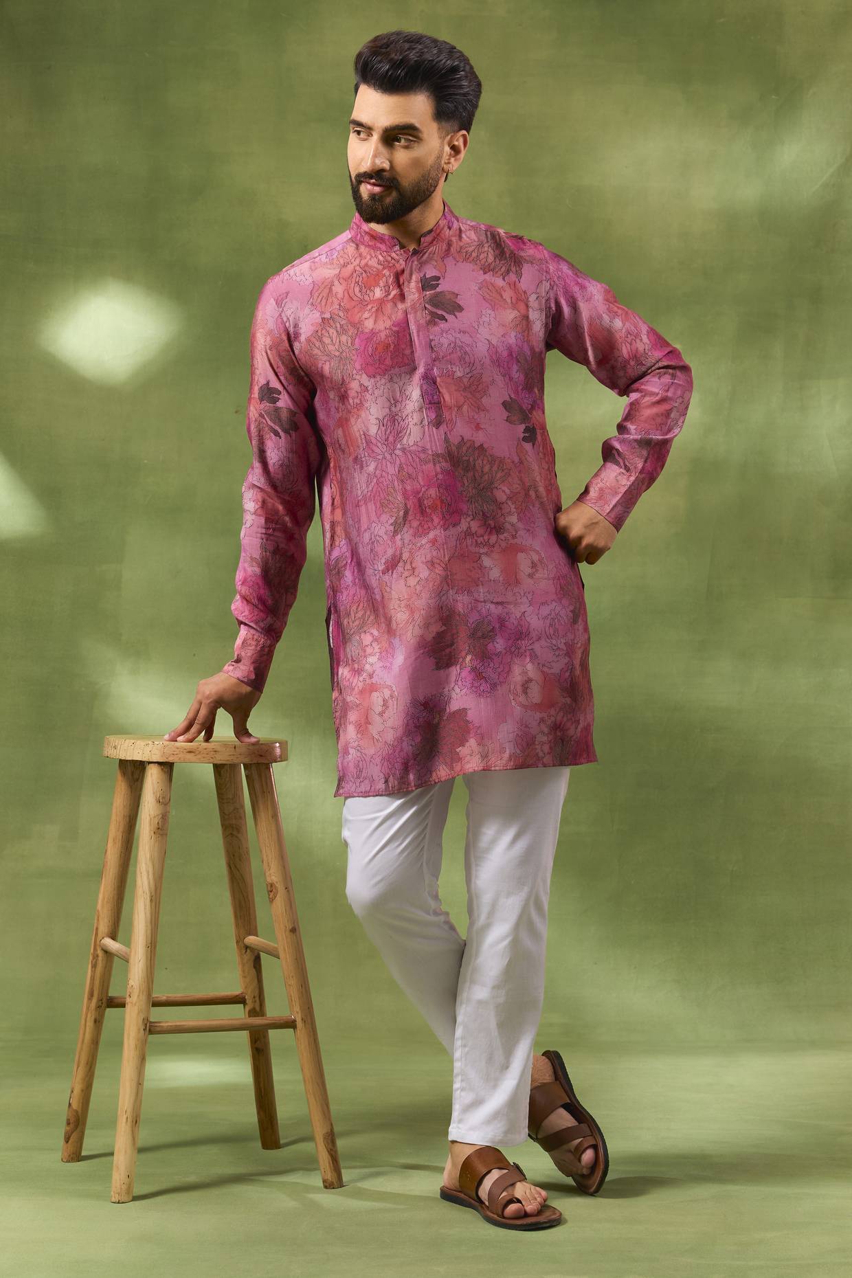 Pink floral digital print kurta in a blended silk base fabric. This kurta is paired with white cotton pants.