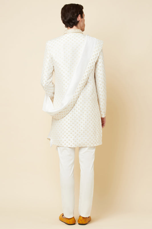 White & Gold Embroidered Polyester Cotton Sherwani Set
