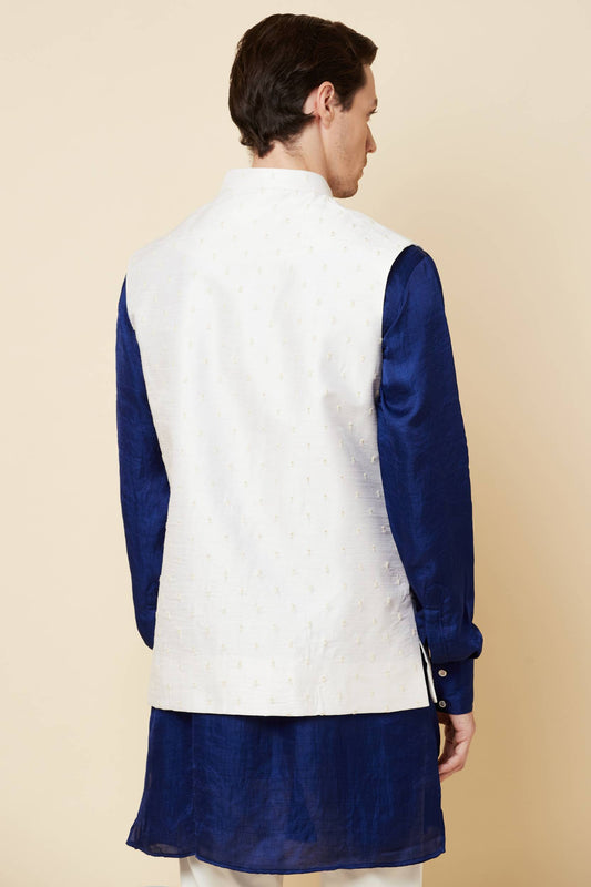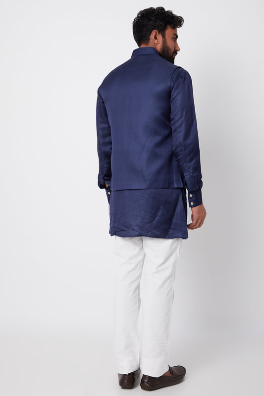 Navy Blue Nehru Linen Satin Jacket With Kurta Set